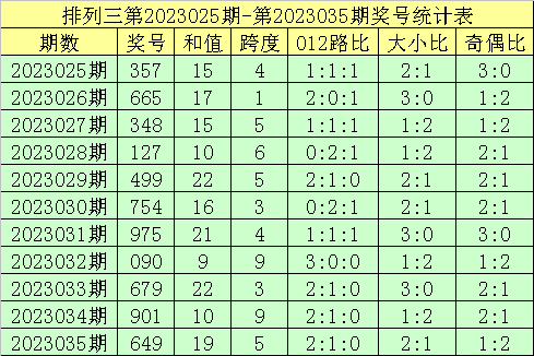 开奖回来:罗列三第2023035期奖号开出:649,组选类型:组六,大小比为2:1,奇偶比为1:2,和值为19,跨度为5。